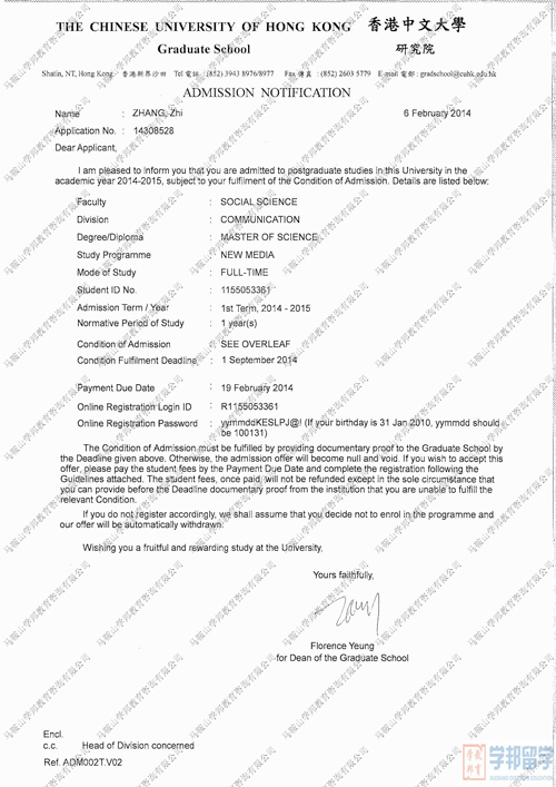 祝贺张同学获得香港中文大学新媒体专业研究生offer