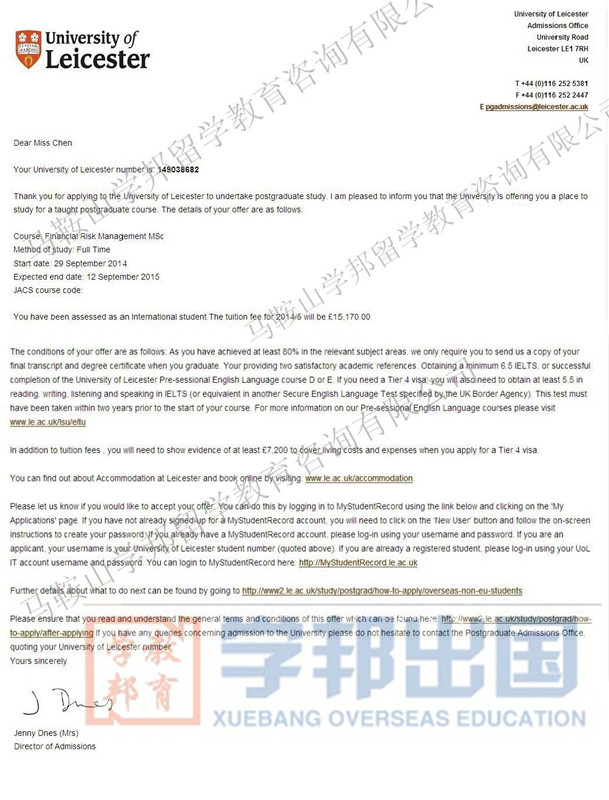 获得英国 莱切斯特大学金融风险管理专业硕士课程通知书!