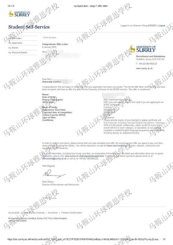 马鞍山留学: 祝贺汪同学获得萨里大学投资管理专业硕士offer