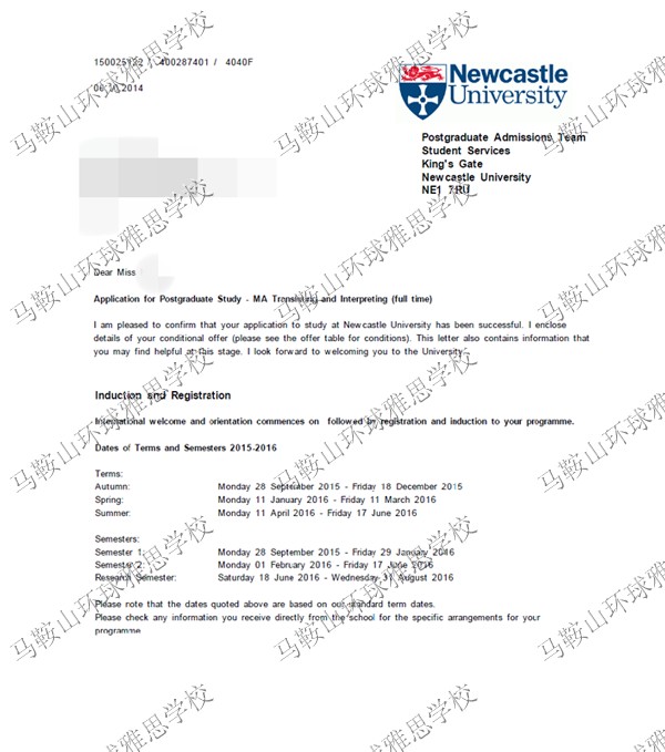 马鞍山留学: 祝贺侯同学获得英国纽卡斯尔大学翻译专业硕士offer