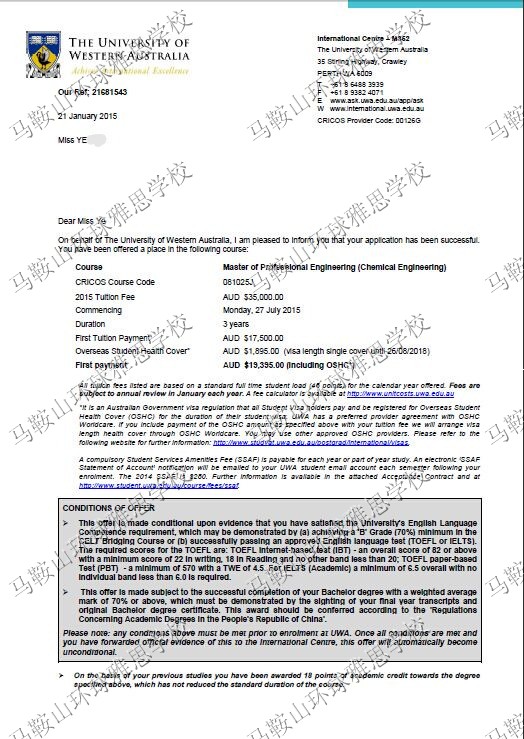 马鞍山留学: 祝贺叶同学获得澳洲西澳大利亚大学化学工程专业硕士offer